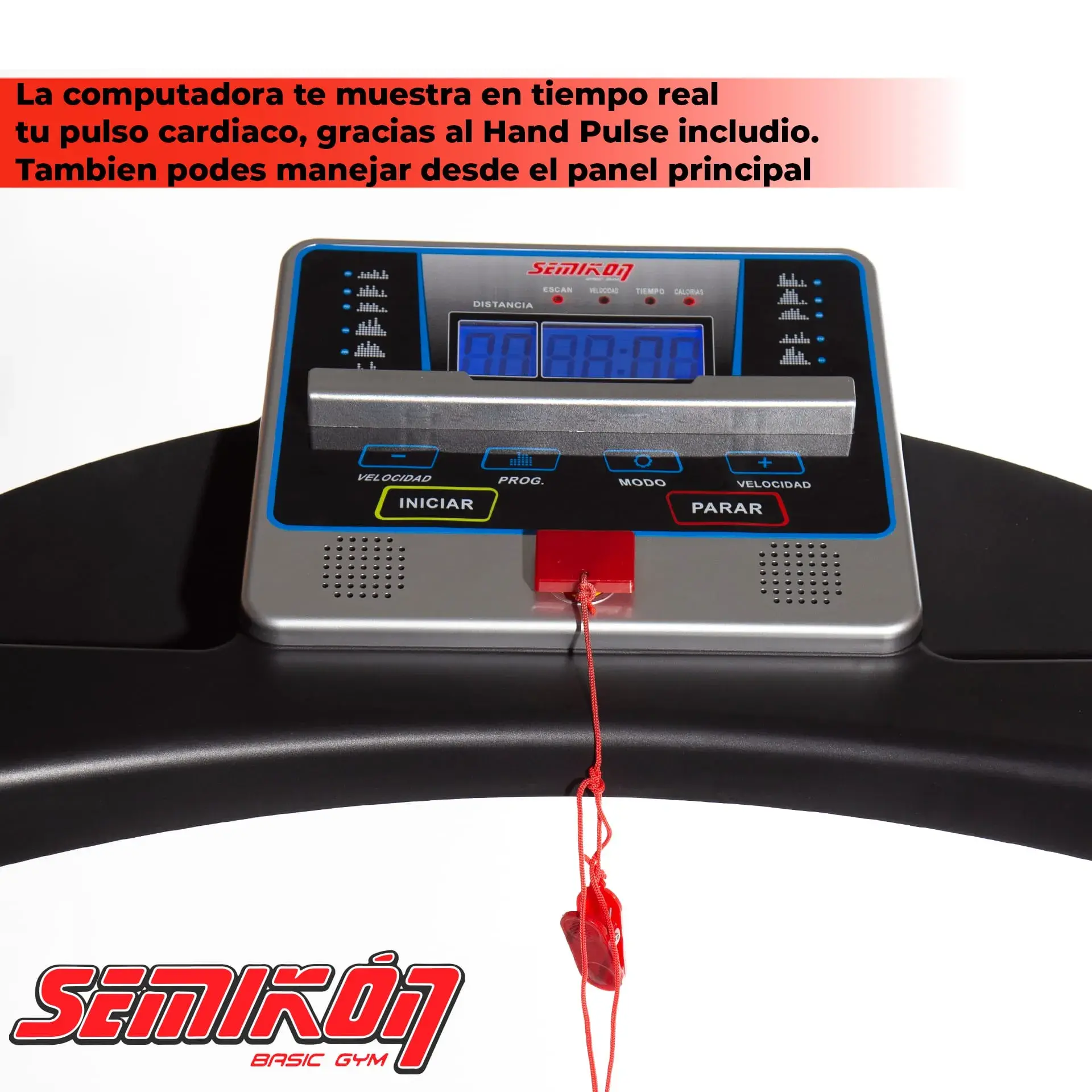 Pantalla LCD azul con 12 programas pre-instalados. Mediciones: Tiempo, Distancia, Calorias, pulsaciones cardiacas. – controles en manillares. Medición de pulso cardíaco por contacto (Hand Pulse)