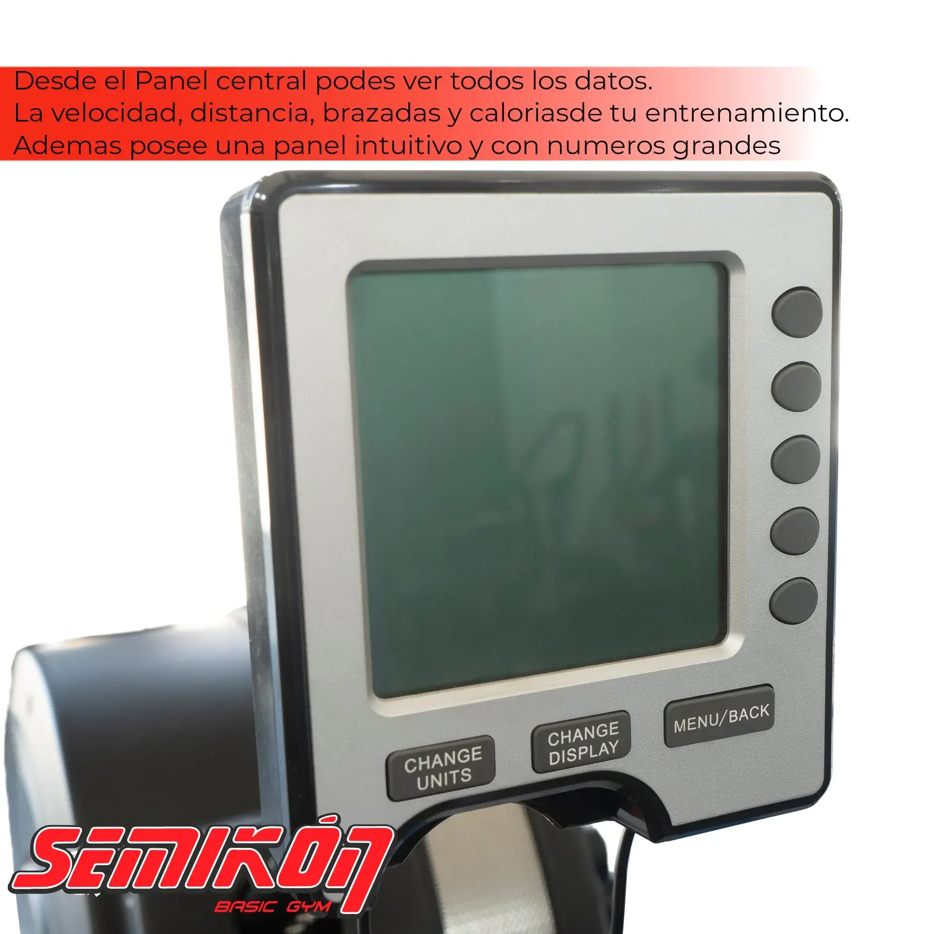 Display de matriz a puntos de 4,5″ de 5 ventanas que muestra mediciones simultaneas, miden Tiempo, distancia, brazadas, calorias, potencia en Watts, memoria automatica